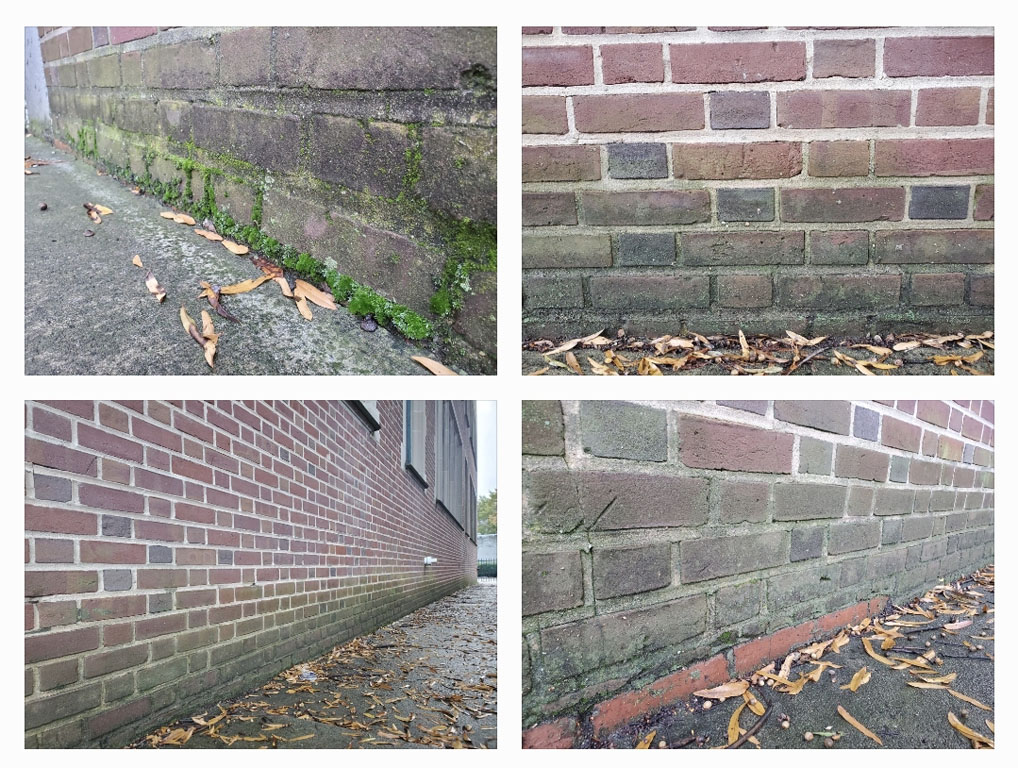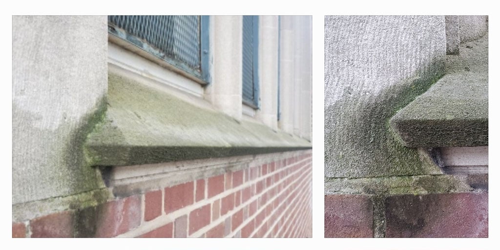 At an adjacent sill in the same facade, there is a darkened area around the window horns, the sill has also experienced concentrations of moisture, as rain water has been conveyed away from the window. Bioconomization is the growth of plants, algae and similar organisms on masonry and concrete and other building materials, as seen in these examples.