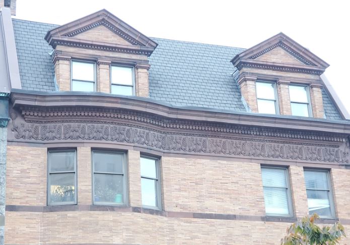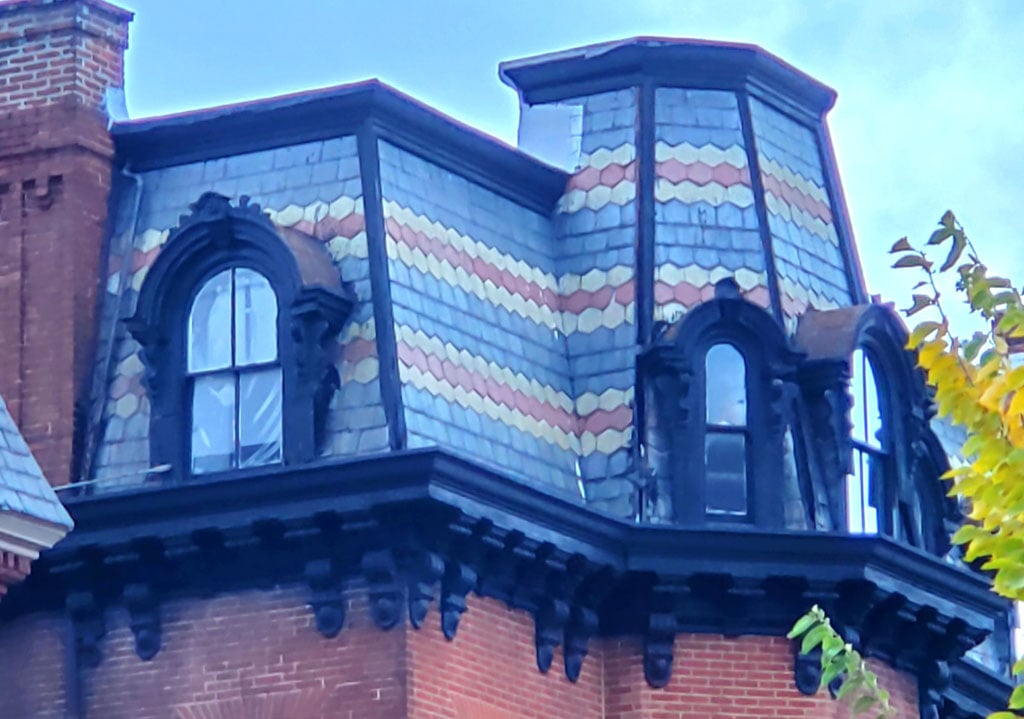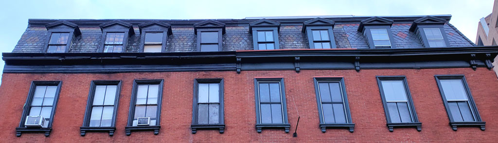 - The picture below shows a row of four buildings, with a continuous slate mansard roof. Each of the buildings has a pair of gable dormers. The Gable at each dormer is relatively shallow, but the gable projects beyond the face of the dormer. Below the mansard, a water table conveys water away from the building facade. At each of the individual buildings, the the cornice and slate mansard are at varying stages of deterioration.