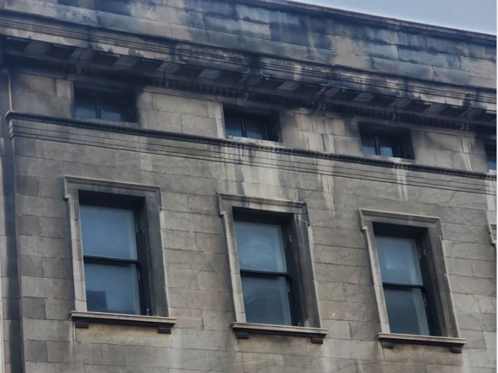 - The image below shows a picture of a sandstone ashlar masonry building facade with a stone enframement built around the window. Above the windows you can see a decorative cornice below a water table.