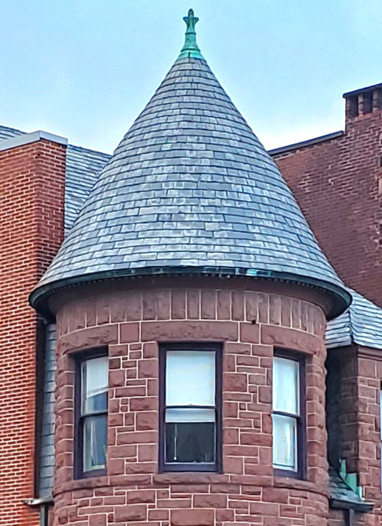 The image below shows a slate turret roof above a brownstone building. The slate shingles terminate at the bottom of the turret at a projecting eave, terminated with a copper metal decorative cornice. The eave projection, in the case of this turret extends approximately 16″ from the face of the brownstone building facade.