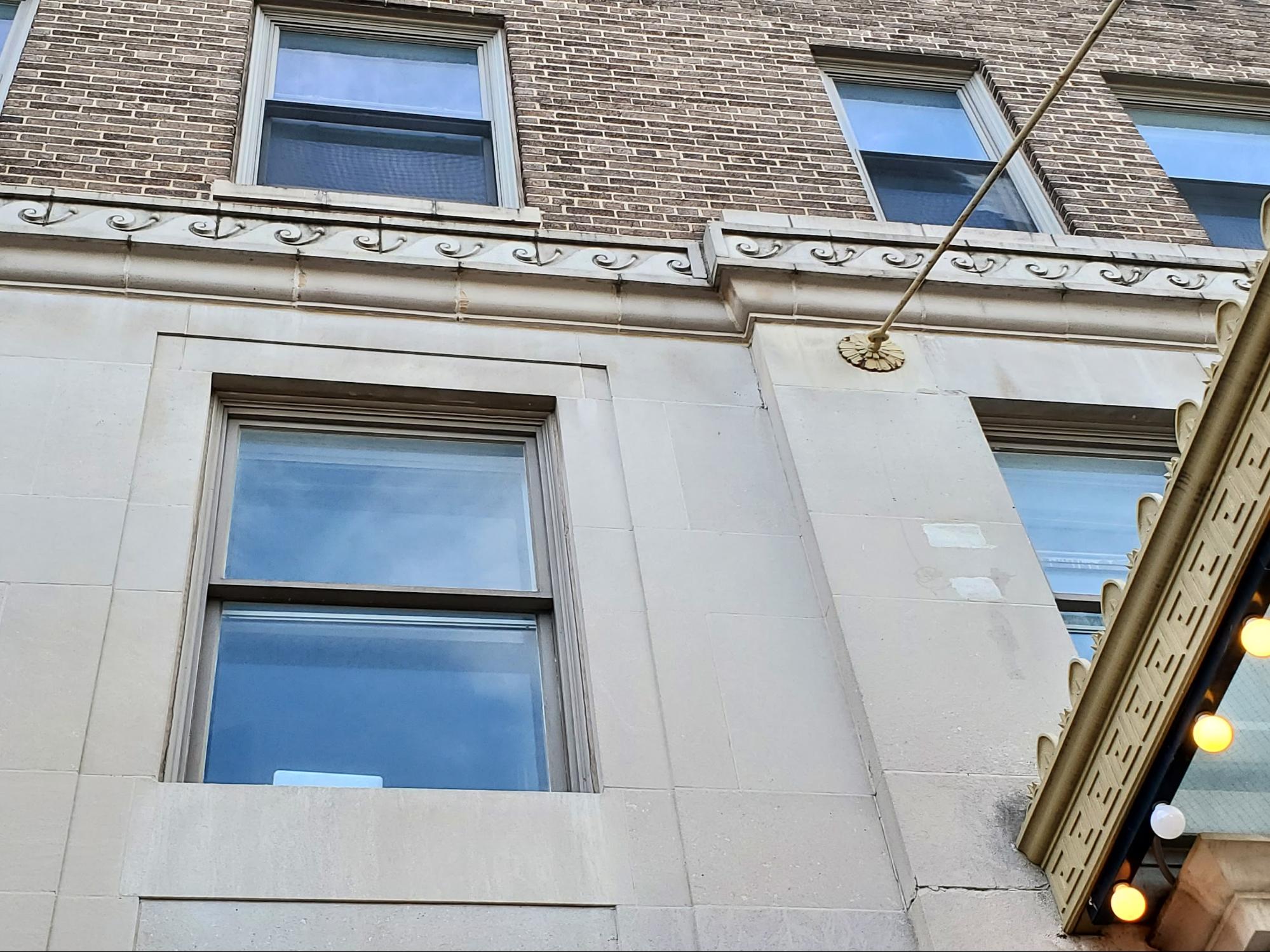 When you look closely though, you can see that there is deterioration at the masonry at the top of the frieze band and also deep recesses in the mortar joints between the individual sections of the limestone. This type of slow but pervasive damage can be mitigated by routine maintenance. This type of maintenance doesn’t have to happen every day and it’s not even expensive but it needs to have a engaged and conscientious masonry contractor to provide careful seasonal cleaning and restoration of the mortar joints. The mortar joints may be able to last many years between each repointing.